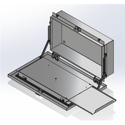 Ripiano richiudibile, montaggio su pannello. Realizzato in lamiera d'acciaio sp. 20/10 verniciato RAL 7035 bucciato. Consente di utilizzare tastiere di comando universali.