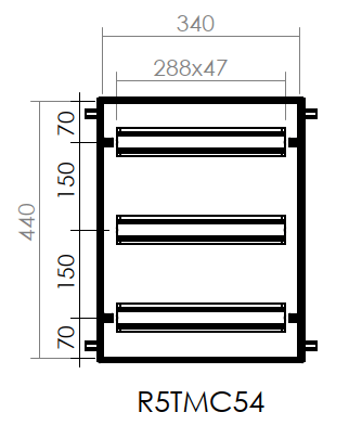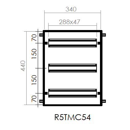 Telaio modulare, grado di protezione IP 20. Struttura in lamiera d'acciaio sp. 15/10 verniciata RAL 7035 bucciato. È fornito già assemblato nelle sue parti, ed è richiesto solo il montaggio nella cassa. Portina frontale, anch'essa in lamiera d'acciaio, con cava e fissata al telaio tramite cerniere. E' dotata di chiusure con viti antisfilamento. Guida DIN per ogni cava modulare.