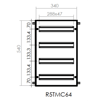 Telaio modulare, grado di protezione IP 20. Struttura in lamiera d'acciaio sp. 15/10 verniciata RAL 7035 bucciato. È fornito già assemblato nelle sue parti, ed è richiesto solo il montaggio nella cassa. Portina frontale, anch'essa in lamiera d'acciaio, con cava e fissata al telaio tramite cerniere. E' dotata di chiusure con viti antisfilamento. Guida DIN per ogni cava modulare.