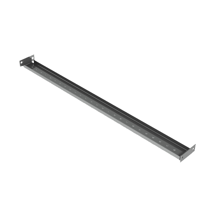Traversa di fissaggio supporti per barre - cavi sul fondo dell'armadio. Realizzata in lamiera d'acciaio zincata Sendzimir sp. 20/10. Il profilo è dotato di una fila di fori diametro 6 e fori diametro 9 con passo 25mm. Confezione da 4 pezzi completa di viteria per il montaggio.