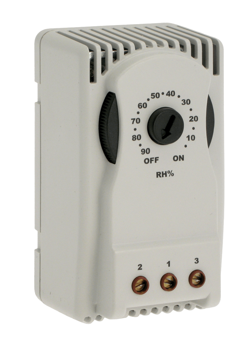 L'igrostato permette il controllo costante dell'umidità all'interno dei quadri elettrici, attivando il riscaldatore anticondensa o il ventilatore al superamento di un valore preimpostato di umidità relativa dell'aria. Struttura esterna in PC/ABS. Grado di protezione: IP 20 secondo EN 60529. L'igrostato può essere montato a scatto su guida 35 mm, secondo EN 50022. Connessione elettrica con terminali a vite.